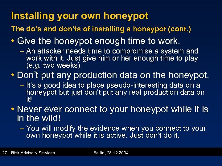 Installing your own honeypot The do’s and don’ts of installing a honeypot • Don’t expect too much! – In the beginning don’t force yourself too much. You will probably want to catch 0 -day exploits but that is a *long* way to go! Start with something simple. • Wipe the hard drive before using it in a honeypot – When recovering files of a compromised honeypot a “dirty” hard disk might confuse you as there is probably old and non-honeypot related data on it which might also be recovered. • Copy the evidence before analyzing it (e. g. with dd). 26 Risk Advisory Services Berlin, 28. 12. 2004