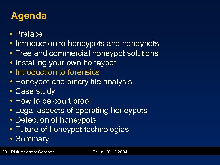 Agenda • • • Preface Introduction to honeypots and honeynets Free and commercial honeypot solutions Installing your own honeypot Introduction to forensics Honeypot and binary file analysis Case study How to be court proof Legal aspects of operating honeypots Detection of honeypots Future of honeypot technologies Summary 28 Risk Advisory Services Berlin, 28. 12. 2004