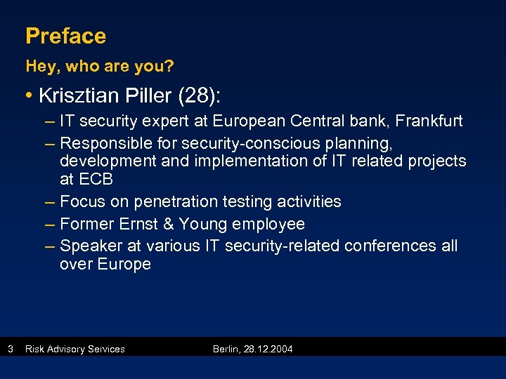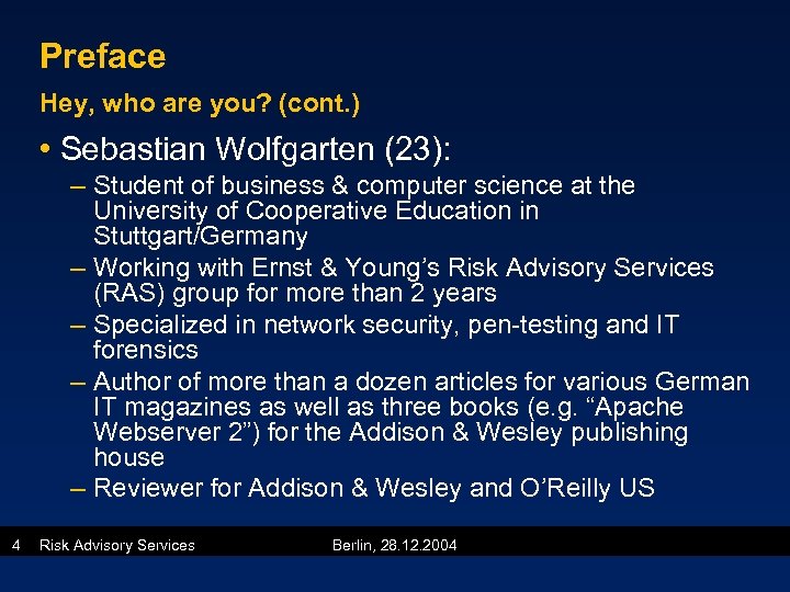 Preface Hey, who are you? (cont. ) • Sebastian Wolfgarten (23): – Student of business & computer science at the University of Cooperative Education in Stuttgart/Germany – Working with Ernst & Young’s Risk Advisory Services (RAS) group for more than 2 years – Specialized in network security, pen-testing and IT forensics – Author of more than a dozen articles for various German IT magazines as well as three books (e. g. “Apache Webserver 2”) for the Addison & Wesley publishing house – Reviewer for Addison & Wesley and O’Reilly US 4 Risk Advisory Services Berlin, 28. 12. 2004
