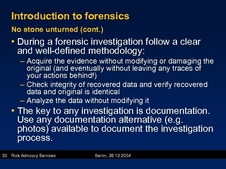 Introduction to forensics No stone unturned (cont. ) • During a forensic investigation follow a clear and well-defined methodology: – Acquire the evidence without modifying or damaging the original (and eventually without leaving any traces of your actions behind!) – Check integrity of recovered data and verify recovered data and original is identical – Analyze the data without modifying it • The key to any investigation is documentation. Use any documentation alternative (e. g. photos) available to document the investigation process. 30 Risk Advisory Services Berlin, 28. 12. 2004