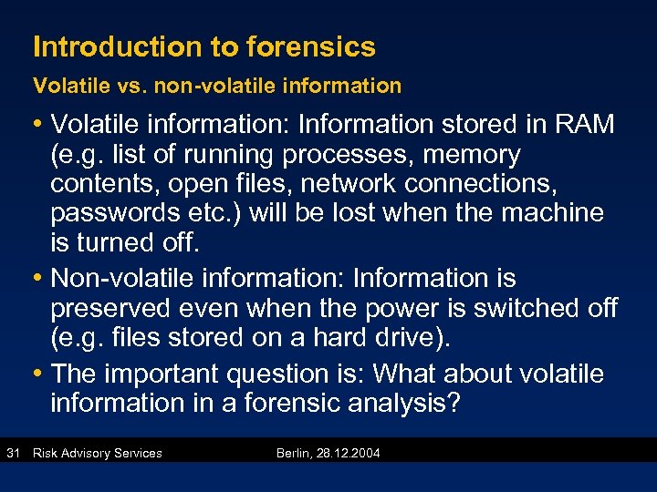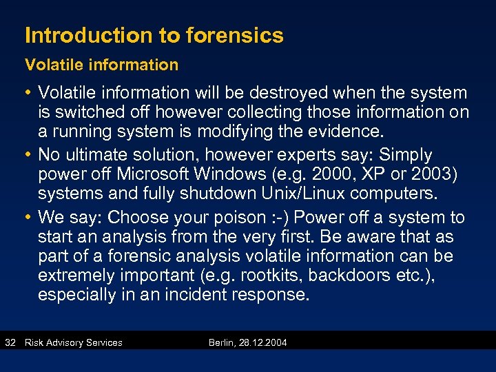 Introduction to forensics Volatile vs. non-volatile information • Volatile information: Information stored in RAM (e. g. list of running processes, memory contents, open files, network connections, passwords etc. ) will be lost when the machine is turned off. • Non-volatile information: Information is preserved even when the power is switched off (e. g. files stored on a hard drive). • The important question is: What about volatile information in a forensic analysis? 31 Risk Advisory Services Berlin, 28. 12. 2004