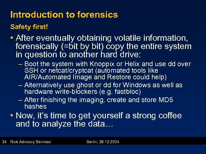 Introduction to forensics Tools/commands for obtaining volatile information • Use safe, statically-linked and non-modified tools (e. g. insert a CD like Helix, see http: //www. efense. com/helix/) to collect volatile information as binaries on target system might have been modified • Unix/Linux: – ps, netstat, ifconfig, date, grep, last, cat, lsof, mount, dd, fdisk, … • Microsoft Windows: – netstat, ipconfig, VICE, diskmon, filemon, handle, listdlls, process explorer, pstools, regmon, tcpview, tdimon, tokenmon, livekd, dir, vision, dumpacl, fport, loggedon, nbtstat, sfind, etc. … • Do not store information obtained on local system but transfer them to a third party (e. g. using netcat or ssh). 33 Risk Advisory Services Berlin, 28. 12. 2004