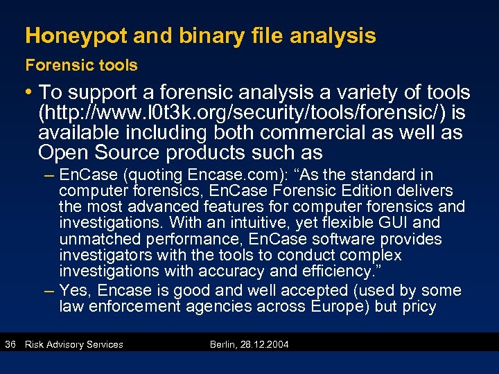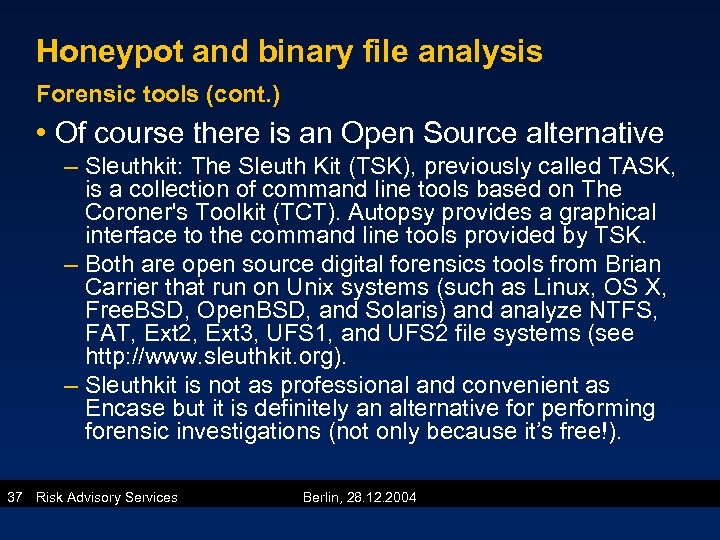 Honeypot and binary file analysis Forensic tools • To support a forensic analysis a variety of tools (http: //www. l 0 t 3 k. org/security/tools/forensic/) is available including both commercial as well as Open Source products such as – En. Case (quoting Encase. com): “As the standard in computer forensics, En. Case Forensic Edition delivers the most advanced features for computer forensics and investigations. With an intuitive, yet flexible GUI and unmatched performance, En. Case software provides investigators with the tools to conduct complex investigations with accuracy and efficiency. ” – Yes, Encase is good and well accepted (used by some law enforcement agencies across Europe) but pricy 36 Risk Advisory Services Berlin, 28. 12. 2004