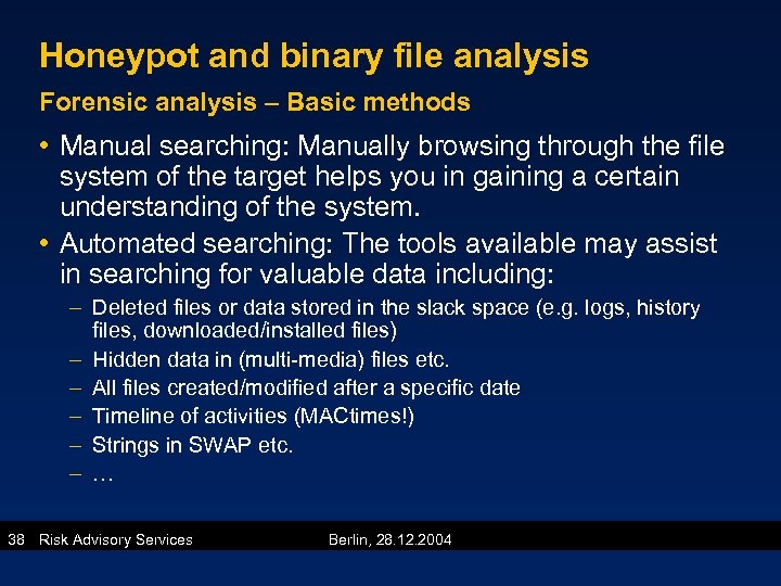 Honeypot and binary file analysis Forensic tools (cont. ) • Of course there is an Open Source alternative – Sleuthkit: The Sleuth Kit (TSK), previously called TASK, is a collection of command line tools based on The Coroner's Toolkit (TCT). Autopsy provides a graphical interface to the command line tools provided by TSK. – Both are open source digital forensics tools from Brian Carrier that run on Unix systems (such as Linux, OS X, Free. BSD, Open. BSD, and Solaris) and analyze NTFS, FAT, Ext 2, Ext 3, UFS 1, and UFS 2 file systems (see http: //www. sleuthkit. org). – Sleuthkit is not as professional and convenient as Encase but it is definitely an alternative for performing forensic investigations (not only because it’s free!). 37 Risk Advisory Services Berlin, 28. 12. 2004