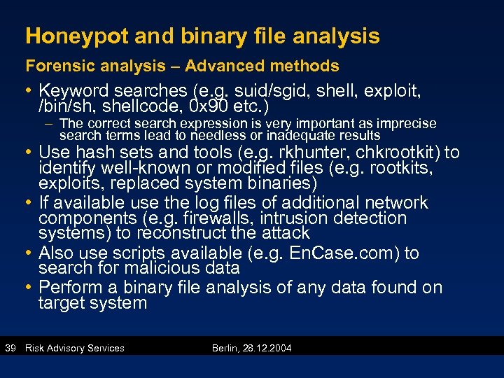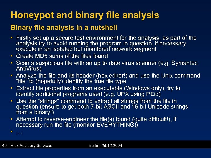 Honeypot and binary file analysis Forensic analysis – Advanced methods • Keyword searches (e. g. suid/sgid, shell, exploit, /bin/sh, shellcode, 0 x 90 etc. ) – The correct search expression is very important as imprecise search terms lead to needless or inadequate results • Use hash sets and tools (e. g. rkhunter, chkrootkit) to identify well-known or modified files (e. g. rootkits, exploits, replaced system binaries) • If available use the log files of additional network components (e. g. firewalls, intrusion detection systems) to reconstruct the attack • Also use scripts available (e. g. En. Case. com) to search for malicious data • Perform a binary file analysis of any data found on target system 39 Risk Advisory Services Berlin, 28. 12. 2004