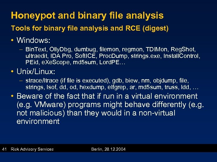 Honeypot and binary file analysis Binary file analysis in a nutshell • Firstly set up a secure test environment for the analysis, as part of the analysis try to avoid running the program in question, if necessary execute in an isolated but monitored network segment • Create MD 5 sums of the files found • Scan a suspicious file with an up to date virus scanner (e. g. Symantec Anti. Virus) • Analyze the file and its header (hex editor!) and use the Unix command “file” to (hopefully) identify the true file type • Extract file properties from an executable (Windows only), try to identify additional programs used (e. g. UPX using PEid) • Use the “strings” command to extract all strings from the file in question (ensure to get both 7 -bit ASCII and 16 bit Unicode strings from a binary!) • Attempt to reverse-engineer the file(s) found (quite difficult!), if necessary run the file (monitor EVERYTHING!) • … 40 Risk Advisory Services Berlin, 28. 12. 2004