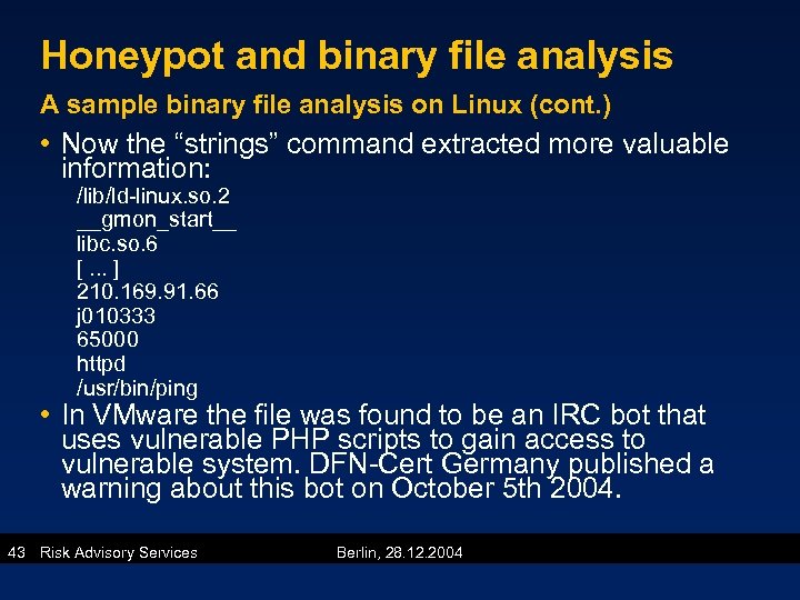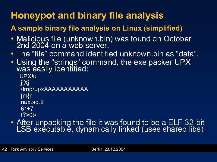 Honeypot and binary file analysis A sample binary file analysis on Linux (simplified) • Malicious file (unknown. bin) was found on October 2 nd 2004 on a web server. • The “file” command identified unknown. bin as “data”. • Using the “strings” command, the exe packer UPX was easily identified: UPX!u j!Xj /tmp/upx. AAAAAA [m{r nux. so. 2 6*+7 t? >09 • After unpacking the file it was found to be a ELF 32 -bit LSB executable, dynamically linked (uses shared libs) 42 Risk Advisory Services Berlin, 28. 12. 2004