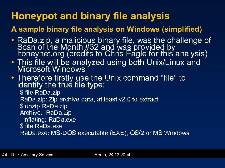 Honeypot and binary file analysis A sample binary file analysis on Windows (simplified) • Ra. Da. zip, a malicious binary file, was the challenge of Scan of the Month #32 and was provided by honeynet. org (credits to Chris Eagle for this analysis) • This file will be analyzed using both Unix/Linux and Microsoft Windows • Therefore firstly use the Unix command “file” to identify the true file type: $ file Ra. Da. zip: Zip archive data, at least v 2. 0 to extract $ unzip Ra. Da. zip Archive: Ra. Da. zip inflating: Ra. Da. exe $ file Ra. Da. exe: MS-DOS executable (EXE), OS/2 or MS Windows 44 Risk Advisory Services Berlin, 28. 12. 2004