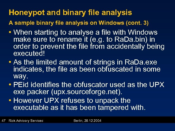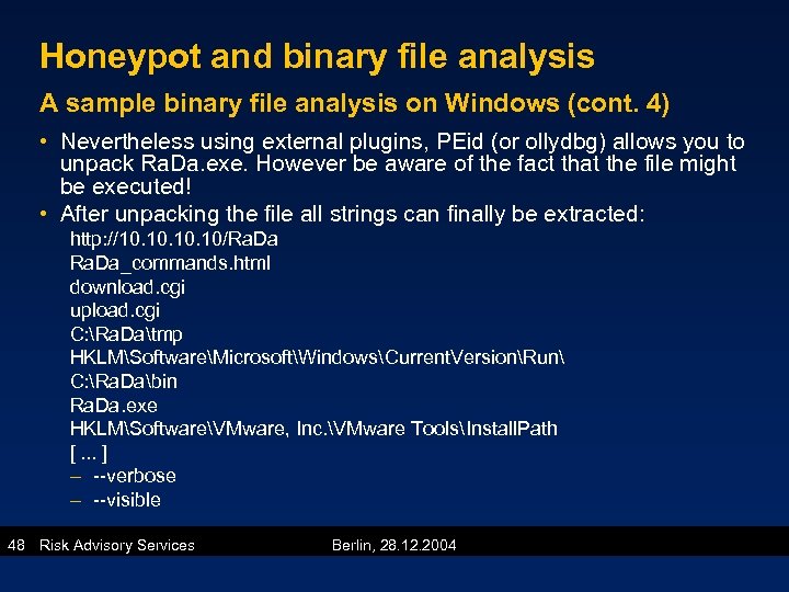 Honeypot and binary file analysis A sample binary file analysis on Windows (cont. 3) • When starting to analyse a file with Windows make sure to rename it (e. g. to Ra. Da. bin) in order to prevent the file from accidentally being executed! • As the limited amount of strings in Ra. Da. exe indicates, the file as been obfuscated in some way. • PEid identifies the obfuscator used as the UPX exe packer (upx. sourceforge. net). • However UPX refuses to unpack the executable as it has been tampered with. 47 Risk Advisory Services Berlin, 28. 12. 2004