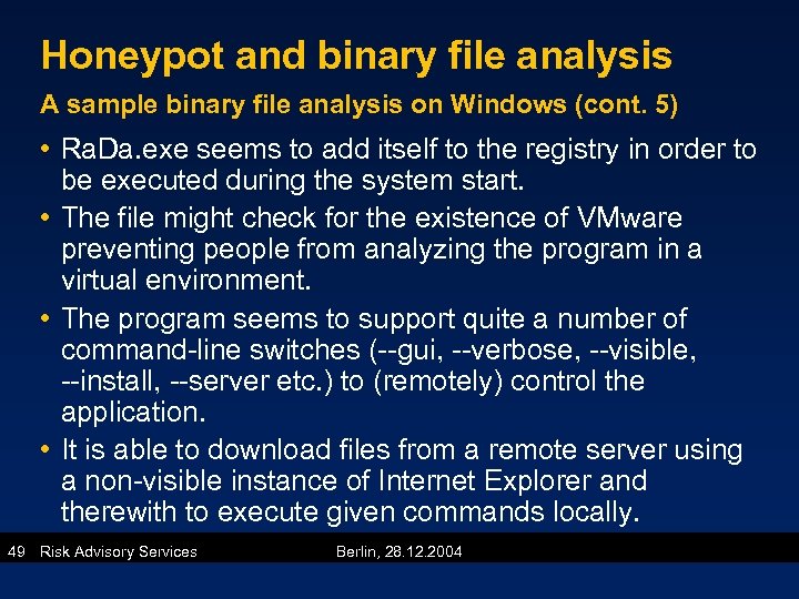 Honeypot and binary file analysis A sample binary file analysis on Windows (cont. 4) • Nevertheless using external plugins, PEid (or ollydbg) allows you to unpack Ra. Da. exe. However be aware of the fact that the file might be executed! • After unpacking the file all strings can finally be extracted: http: //10. 10. 10/Ra. Da_commands. html download. cgi upload. cgi C: Ra. Datmp HKLMSoftwareMicrosoftWindowsCurrent. VersionRun C: Ra. Dabin Ra. Da. exe HKLMSoftwareVMware, Inc. VMware ToolsInstall. Path [. . . ] – --verbose – --visible 48 Risk Advisory Services Berlin, 28. 12. 2004
