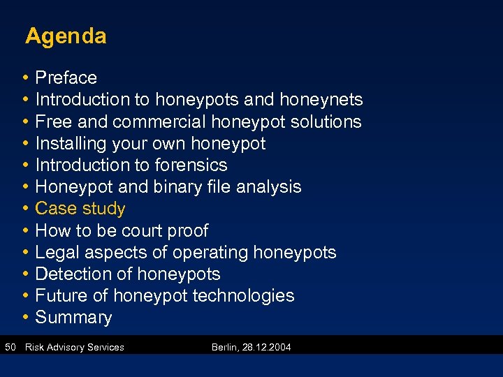 Agenda • • • Preface Introduction to honeypots and honeynets Free and commercial honeypot solutions Installing your own honeypot Introduction to forensics Honeypot and binary file analysis Case study How to be court proof Legal aspects of operating honeypots Detection of honeypots Future of honeypot technologies Summary 50 Risk Advisory Services Berlin, 28. 12. 2004