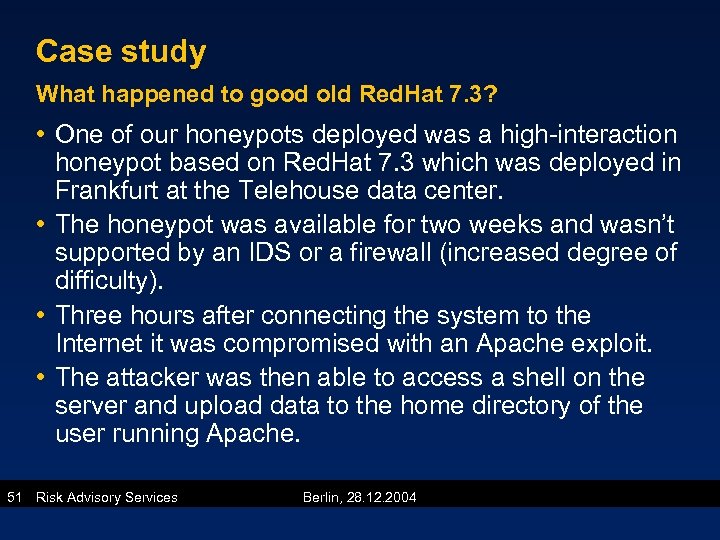 Case study What happened to good old Red. Hat 7. 3? • One of our honeypots deployed was a high-interaction honeypot based on Red. Hat 7. 3 which was deployed in Frankfurt at the Telehouse data center. • The honeypot was available for two weeks and wasn’t supported by an IDS or a firewall (increased degree of difficulty). • Three hours after connecting the system to the Internet it was compromised with an Apache exploit. • The attacker was then able to access a shell on the server and upload data to the home directory of the user running Apache. 51 Risk Advisory Services Berlin, 28. 12. 2004