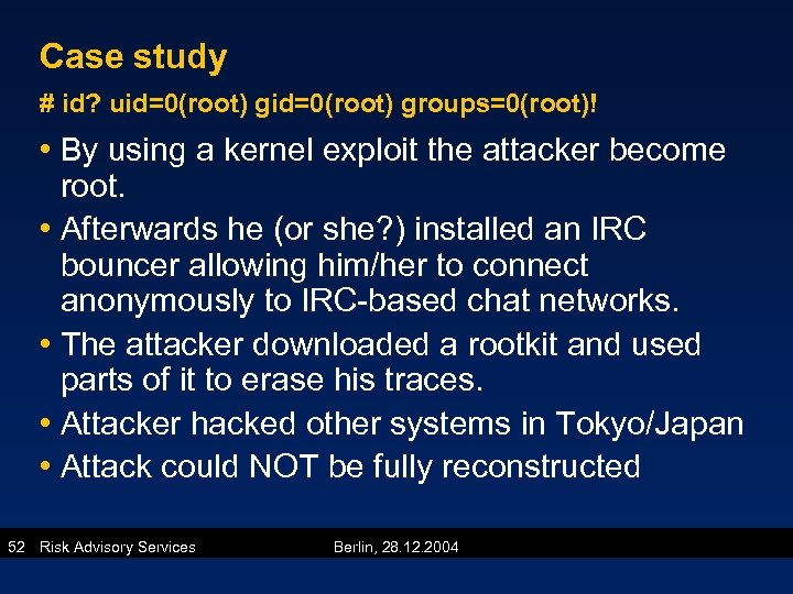 Case study # id? uid=0(root) groups=0(root)! • By using a kernel exploit the attacker become root. • Afterwards he (or she? ) installed an IRC bouncer allowing him/her to connect anonymously to IRC-based chat networks. • The attacker downloaded a rootkit and used parts of it to erase his traces. • Attacker hacked other systems in Tokyo/Japan • Attack could NOT be fully reconstructed 52 Risk Advisory Services Berlin, 28. 12. 2004