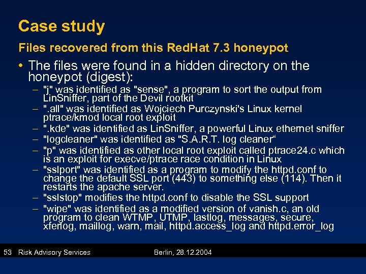 Case study Files recovered from this Red. Hat 7. 3 honeypot • The files were found in a hidden directory on the honeypot (digest): – "j" was identified as "sense", a program to sort the output from Lin. Sniffer, part of the Devil rootkit – ". all" was identified as Wojciech Purczynski's Linux kernel ptrace/kmod local root exploit – ". kde" was identified as Lin. Sniffer, a powerful Linux ethernet sniffer – "logcleaner" was identified as "S. A. R. T. log cleaner“ – "p" was identified as other local root exploit called ptrace 24. c which is an exploit for execve/ptrace condition in Linux – "sslport" was identified as a program to modify the httpd. conf to change the default SSL port (443) to something else (114). Then it restarts the apache server. – "sslstop" modifies the httpd. conf to disable the SSL support – "wipe" was identified as a modified version of vanish. c, an old program to clean WTMP, UTMP, lastlog, messages, secure, xferlog, maillog, warn, mail, httpd. access_log and httpd. error_log 53 Risk Advisory Services Berlin, 28. 12. 2004
