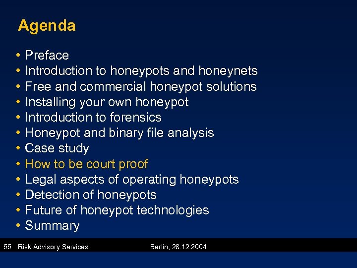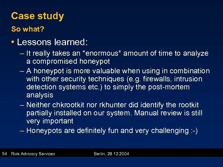 Case study So what? • Lessons learned: – It really takes an *enormous* amount of time to analyze a compromised honeypot – A honeypot is more valuable when using in combination with other security techniques (e. g. firewalls, intrusion detection systems etc. ) to simply the post-mortem analysis – Neither chkrootkit nor rkhunter did identify the rootkit partially installed on our system. Manual review is still very important – Honeypots are definitely fun and very challenging : -) 54 Risk Advisory Services Berlin, 28. 12. 2004