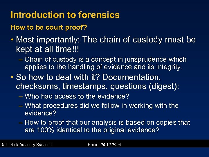 Introduction to forensics How to be court proof? • Most importantly: The chain of custody must be kept at all time!!! – Chain of custody is a concept in jurisprudence which applies to the handling of evidence and its integrity. • So how to deal with it? Documentation, checksums, timestamps, questions (digest): – Who had access to the evidence? – What procedures did we follow in working with the evidence? – How to proof that our analysis is based on copies that are 100% identical to the original evidence? 56 Risk Advisory Services Berlin, 28. 12. 2004