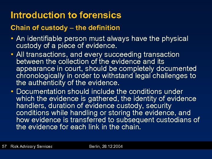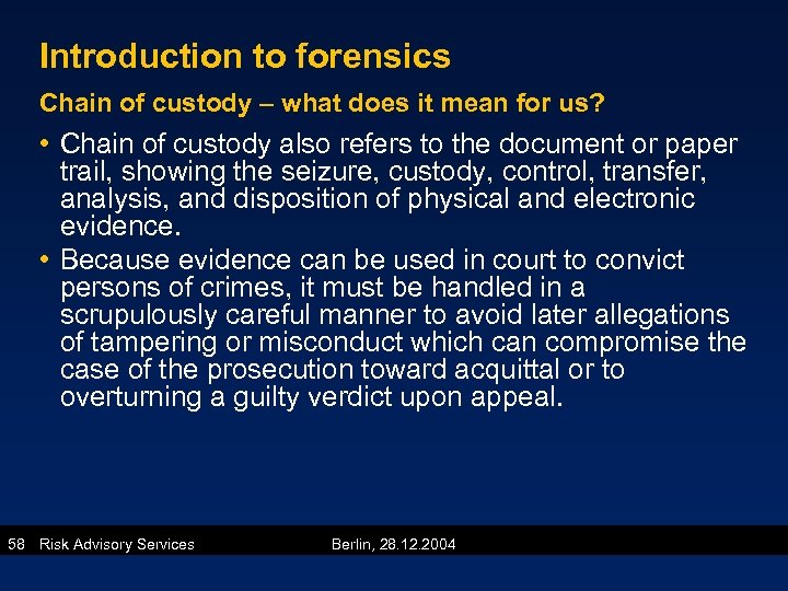 Introduction to forensics Chain of custody – the definition • An identifiable person must always have the physical custody of a piece of evidence. • All transactions, and every succeeding transaction between the collection of the evidence and its appearance in court, should be completely documented chronologically in order to withstand legal challenges to the authenticity of the evidence. • Documentation should include the conditions under which the evidence is gathered, the identity of evidence handlers, duration of evidence custody, security conditions while handling or storing the evidence, and how evidence is transferred to subsequent custodians of the evidence for each link in the chain. 57 Risk Advisory Services Berlin, 28. 12. 2004