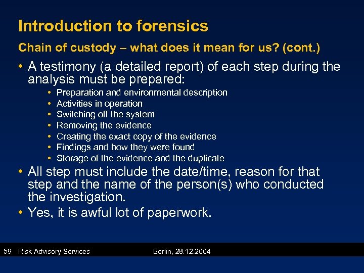 Introduction to forensics Chain of custody – what does it mean for us? • Chain of custody also refers to the document or paper trail, showing the seizure, custody, control, transfer, analysis, and disposition of physical and electronic evidence. • Because evidence can be used in court to convict persons of crimes, it must be handled in a scrupulously careful manner to avoid later allegations of tampering or misconduct which can compromise the case of the prosecution toward acquittal or to overturning a guilty verdict upon appeal. 58 Risk Advisory Services Berlin, 28. 12. 2004