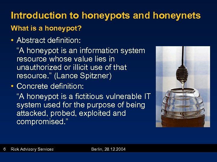 Agenda • • • 5 Preface Introduction to honeypots and honeynets Free and commercial honeypot solutions Installing your own honeypot Introduction to forensics Honeypot and binary file analysis Case study How to be court proof Legal aspects of operating honeypots Detection of honeypots Future of honeypot technologies Summary Risk Advisory Services Berlin, 28. 12. 2004