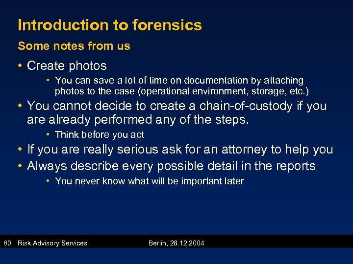 Introduction to forensics Chain of custody – what does it mean for us? (cont. ) • A testimony (a detailed report) of each step during the analysis must be prepared: • • Preparation and environmental description Activities in operation Switching off the system Removing the evidence Creating the exact copy of the evidence Findings and how they were found Storage of the evidence and the duplicate • All step must include the date/time, reason for that step and the name of the person(s) who conducted the investigation. • Yes, it is awful lot of paperwork. 59 Risk Advisory Services Berlin, 28. 12. 2004
