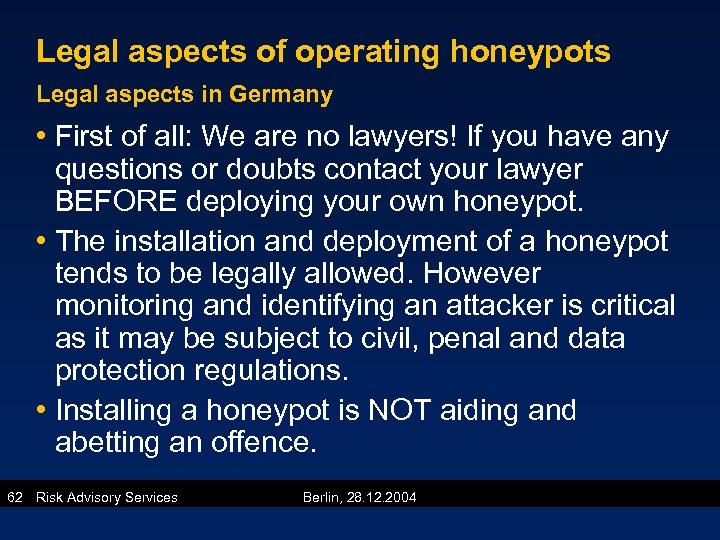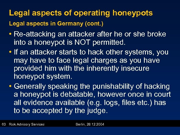 Legal aspects of operating honeypots Legal aspects in Germany (cont. ) • Re-attacking an attacker after he or she broke into a honeypot is NOT permitted. • If an attacker starts to hack other systems, you may have to face legal charges as you have provided him with the inherently insecure honeypot system. • Generally speaking the punishability of hacking a honeypot is debatable, however once in court all evidence available (e. g. logs, files etc. ) has to be accepted by the judge. 63 Risk Advisory Services Berlin, 28. 12. 2004