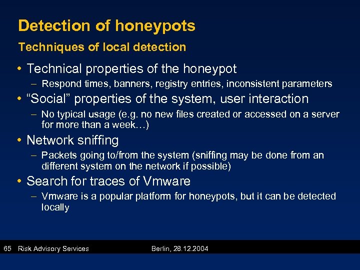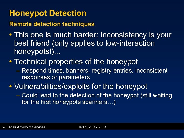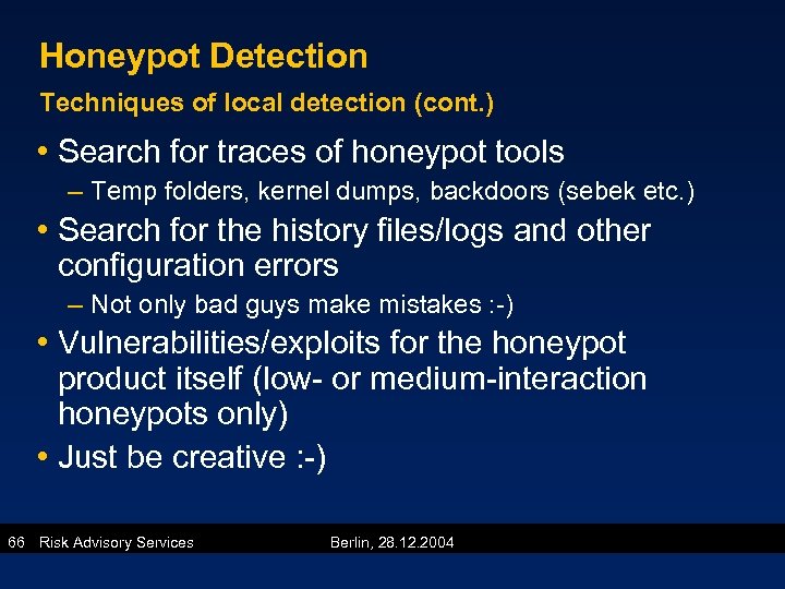 Detection of honeypots Techniques of local detection • Technical properties of the honeypot – Respond times, banners, registry entries, inconsistent parameters • “Social” properties of the system, user interaction – No typical usage (e. g. no new files created or accessed on a server for more than a week…) • Network sniffing – Packets going to/from the system (sniffing may be done from an different system on the network if possible) • Search for traces of Vmware – Vmware is a popular platform for honeypots, but it can be detected locally 65 Risk Advisory Services Berlin, 28. 12. 2004
