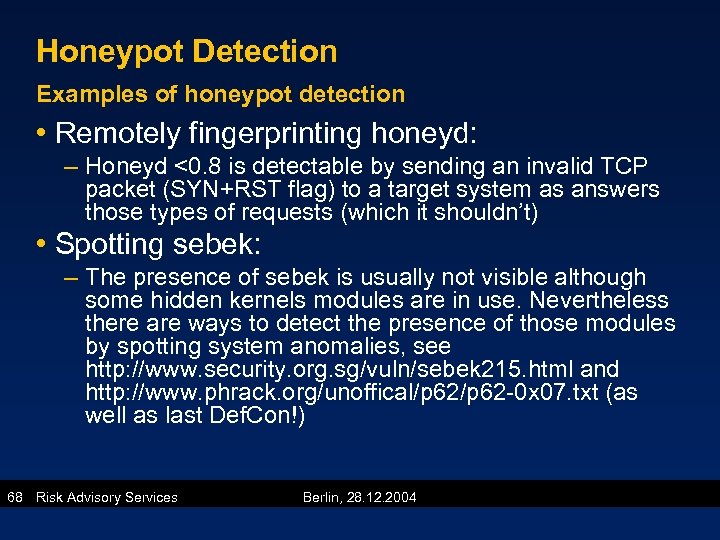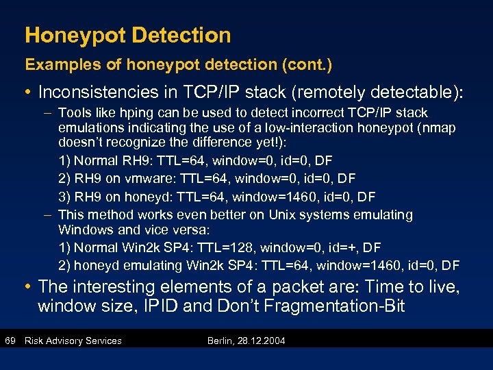 Honeypot Detection Examples of honeypot detection • Remotely fingerprinting honeyd: – Honeyd <0. 8 is detectable by sending an invalid TCP packet (SYN+RST flag) to a target system as answers those types of requests (which it shouldn’t) • Spotting sebek: – The presence of sebek is usually not visible although some hidden kernels modules are in use. Nevertheless there are ways to detect the presence of those modules by spotting system anomalies, see http: //www. security. org. sg/vuln/sebek 215. html and http: //www. phrack. org/unoffical/p 62 -0 x 07. txt (as well as last Def. Con!) 68 Risk Advisory Services Berlin, 28. 12. 2004
