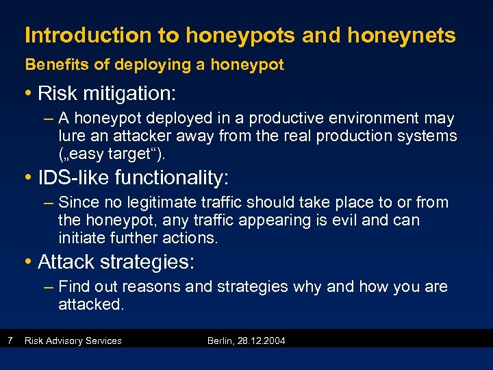 Introduction to honeypots and honeynets What is a honeypot? • Abstract definition: “A honeypot is an information system resource whose value lies in unauthorized or illicit use of that resource. ” (Lance Spitzner) • Concrete definition: “A honeypot is a fictitious vulnerable IT system used for the purpose of being attacked, probed, exploited and compromised. ” 6 Risk Advisory Services Berlin, 28. 12. 2004
