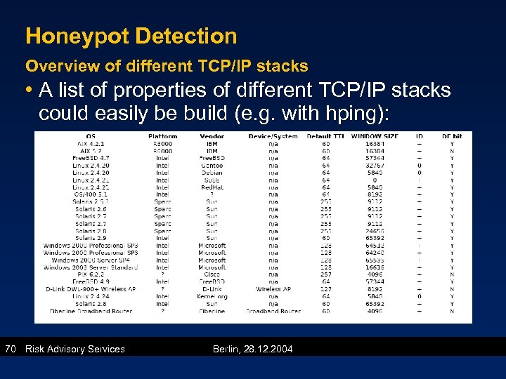 Honeypot Detection Examples of honeypot detection (cont. ) • Inconsistencies in TCP/IP stack (remotely detectable): – Tools like hping can be used to detect incorrect TCP/IP stack emulations indicating the use of a low-interaction honeypot (nmap doesn’t recognize the difference yet!): 1) Normal RH 9: TTL=64, window=0, id=0, DF 2) RH 9 on vmware: TTL=64, window=0, id=0, DF 3) RH 9 on honeyd: TTL=64, window=1460, id=0, DF – This method works even better on Unix systems emulating Windows and vice versa: 1) Normal Win 2 k SP 4: TTL=128, window=0, id=+, DF 2) honeyd emulating Win 2 k SP 4: TTL=64, window=1460, id=0, DF • The interesting elements of a packet are: Time to live, window size, IPID and Don’t Fragmentation-Bit 69 Risk Advisory Services Berlin, 28. 12. 2004