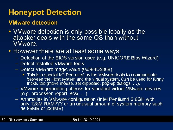 Honeypot Detection VMware detection • VMware detection is only possible locally as the attacker deals with the same OS than without VMware. • However there at least some ways: – Detection of the BIOS version used (e. g. UNICORE Bios Wizard) – Detect installed VMware-tools – Detect VMware magic value (0 x 564 D 5868) • This is a special I/O Port used by the VMware-tools to communicate between the Host system and the virtual system. Can be used for funny tricks, too (move mouse, set clipboard, pop-up dialogs, …). – VMware fingerprinting checks for standard virtual VMware devices (e. g. processor, ioport, scsi, …) – Anomalies in VMware configuration (Intel Pentium 4 2, 6 GH with only 128 M RAM? ? ? or an unusual amount of system memory such as 96 MB or 224 MB) 72 Risk Advisory Services Berlin, 28. 12. 2004