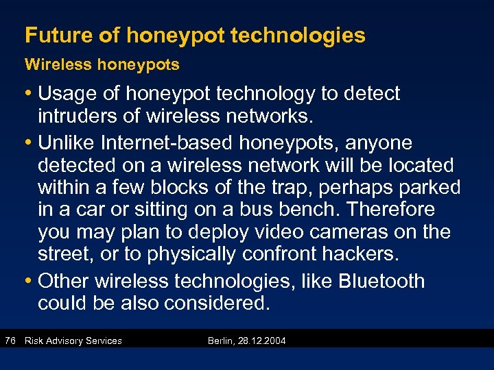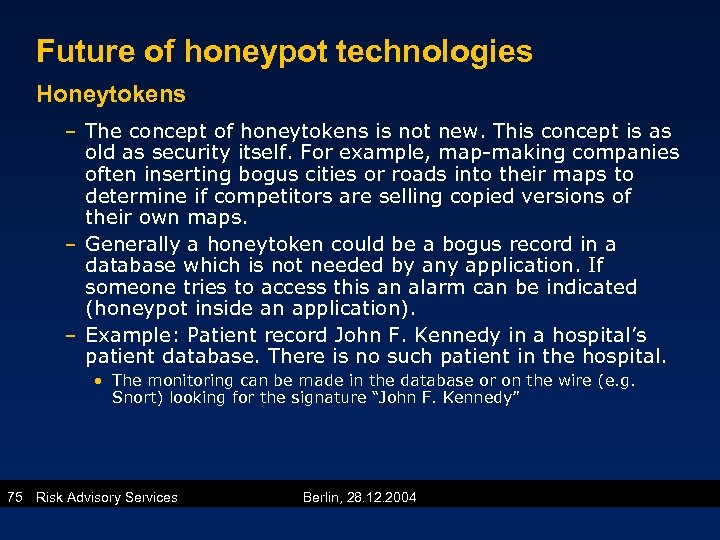 Future of honeypot technologies Honeytokens – The concept of honeytokens is not new. This concept is as old as security itself. For example, map-making companies often inserting bogus cities or roads into their maps to determine if competitors are selling copied versions of their own maps. – Generally a honeytoken could be a bogus record in a database which is not needed by any application. If someone tries to access this an alarm can be indicated (honeypot inside an application). – Example: Patient record John F. Kennedy in a hospital’s patient database. There is no such patient in the hospital. • The monitoring can be made in the database or on the wire (e. g. Snort) looking for the signature “John F. Kennedy” 75 Risk Advisory Services Berlin, 28. 12. 2004