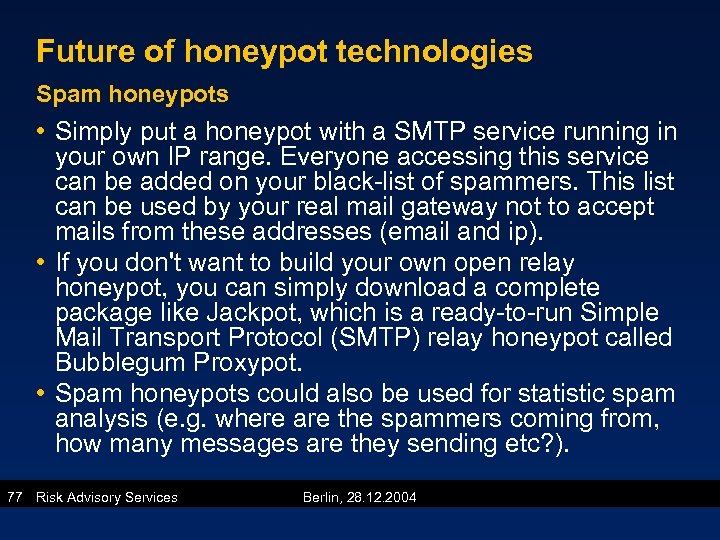 Future of honeypot technologies Spam honeypots • Simply put a honeypot with a SMTP service running in your own IP range. Everyone accessing this service can be added on your black-list of spammers. This list can be used by your real mail gateway not to accept mails from these addresses (email and ip). • If you don't want to build your own open relay honeypot, you can simply download a complete package like Jackpot, which is a ready-to-run Simple Mail Transport Protocol (SMTP) relay honeypot called Bubblegum Proxypot. • Spam honeypots could also be used for statistic spam analysis (e. g. where are the spammers coming from, how many messages are they sending etc? ). 77 Risk Advisory Services Berlin, 28. 12. 2004
