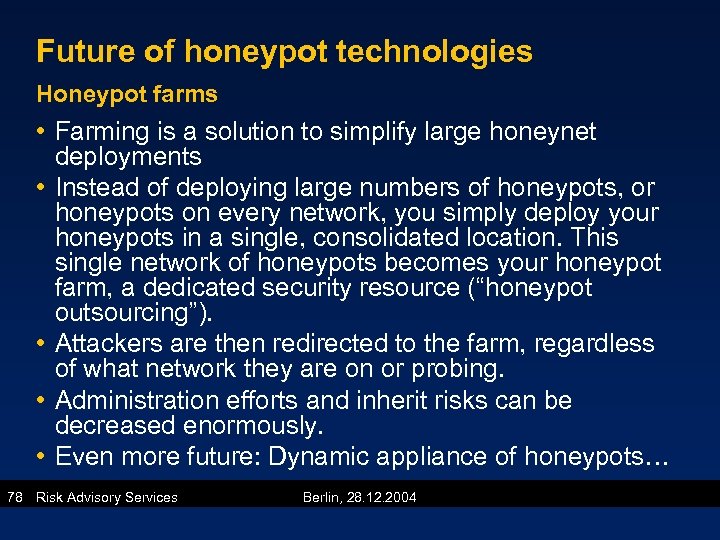 Future of honeypot technologies Honeypot farms • Farming is a solution to simplify large honeynet deployments • Instead of deploying large numbers of honeypots, or honeypots on every network, you simply deploy your honeypots in a single, consolidated location. This single network of honeypots becomes your honeypot farm, a dedicated security resource (“honeypot outsourcing”). • Attackers are then redirected to the farm, regardless of what network they are on or probing. • Administration efforts and inherit risks can be decreased enormously. • Even more future: Dynamic appliance of honeypots… 78 Risk Advisory Services Berlin, 28. 12. 2004