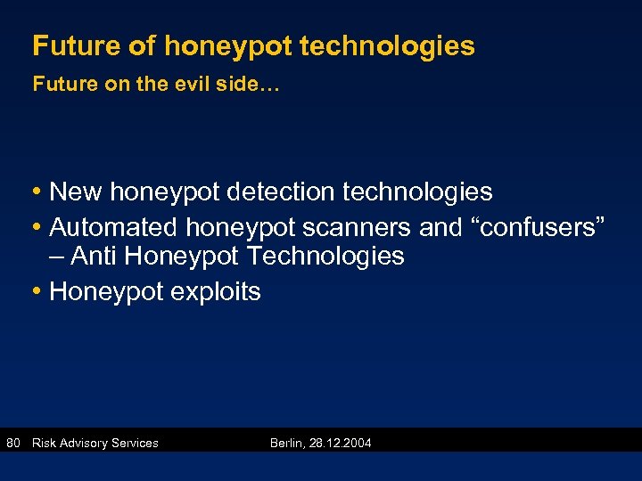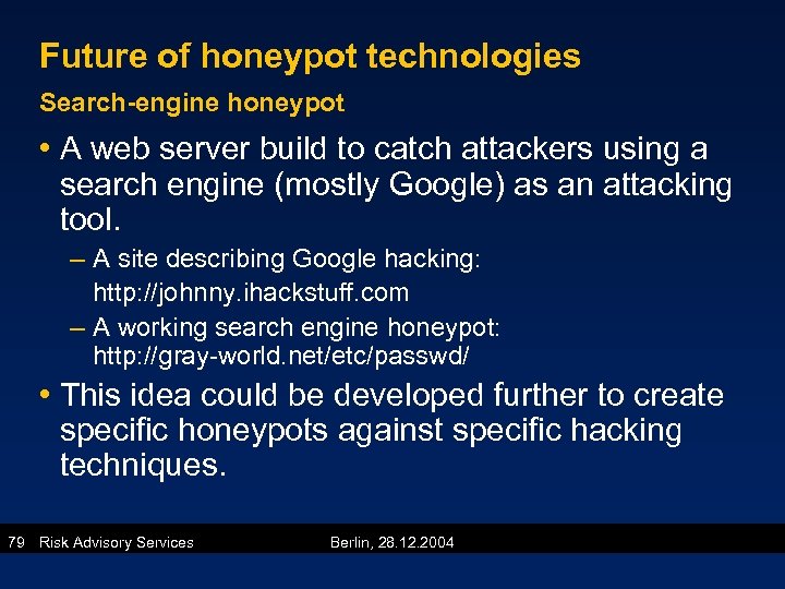 Future of honeypot technologies Search-engine honeypot • A web server build to catch attackers using a search engine (mostly Google) as an attacking tool. – A site describing Google hacking: http: //johnny. ihackstuff. com – A working search engine honeypot: http: //gray-world. net/etc/passwd/ • This idea could be developed further to create specific honeypots against specific hacking techniques. 79 Risk Advisory Services Berlin, 28. 12. 2004