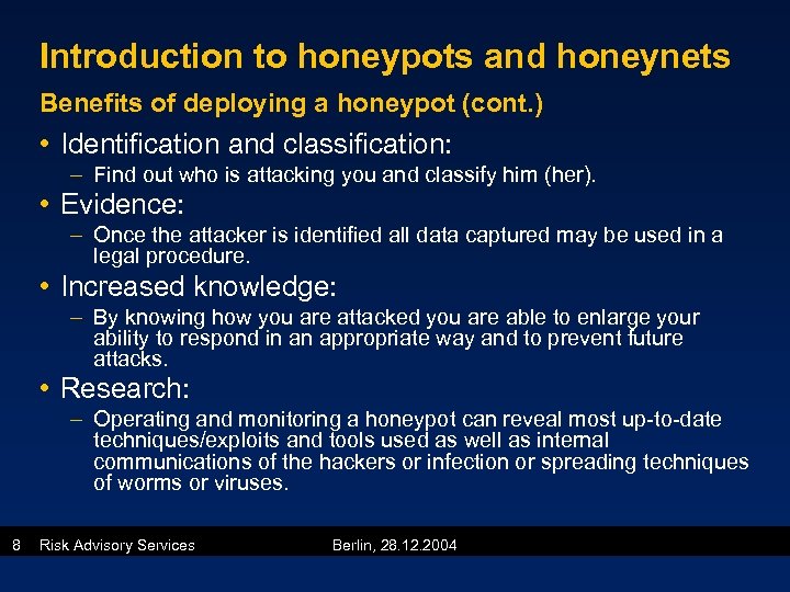 Introduction to honeypots and honeynets Benefits of deploying a honeypot • Risk mitigation: – A honeypot deployed in a productive environment may lure an attacker away from the real production systems („easy target“). • IDS-like functionality: – Since no legitimate traffic should take place to or from the honeypot, any traffic appearing is evil and can initiate further actions. • Attack strategies: – Find out reasons and strategies why and how you are attacked. 7 Risk Advisory Services Berlin, 28. 12. 2004