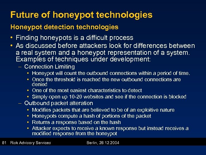 Future of honeypot technologies Future on the evil side… • New honeypot detection technologies • Automated honeypot scanners and “confusers” – Anti Honeypot Technologies • Honeypot exploits 80 Risk Advisory Services Berlin, 28. 12. 2004