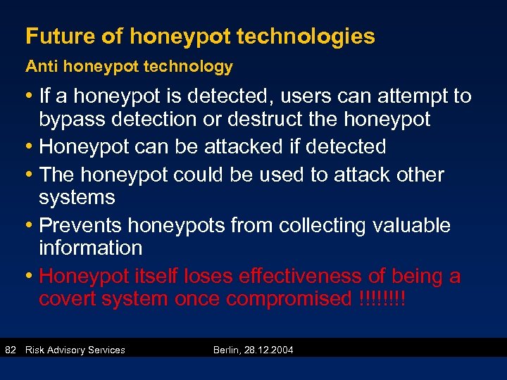 Future of honeypot technologies Anti honeypot technology • If a honeypot is detected, users can attempt to bypass detection or destruct the honeypot • Honeypot can be attacked if detected • The honeypot could be used to attack other systems • Prevents honeypots from collecting valuable information • Honeypot itself loses effectiveness of being a covert system once compromised !!!! 82 Risk Advisory Services Berlin, 28. 12. 2004