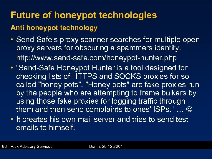 Future of honeypot technologies Anti honeypot technology • Send-Safe’s proxy scanner searches for multiple open proxy servers for obscuring a spammers identity. http: //www. send-safe. com/honeypot-hunter. php • “Send-Safe Honeypot Hunter is a tool designed for checking lists of HTTPS and SOCKS proxies for so called "honey pots". "Honey pots" are fake proxies run by the people who are attempting to frame bulkers by using those fake proxies for logging traffic through them and then send complaints to ones' ISPs. ” … • It creates his own mail server and tries to send test emails to himself. 83 Risk Advisory Services Berlin, 28. 12. 2004