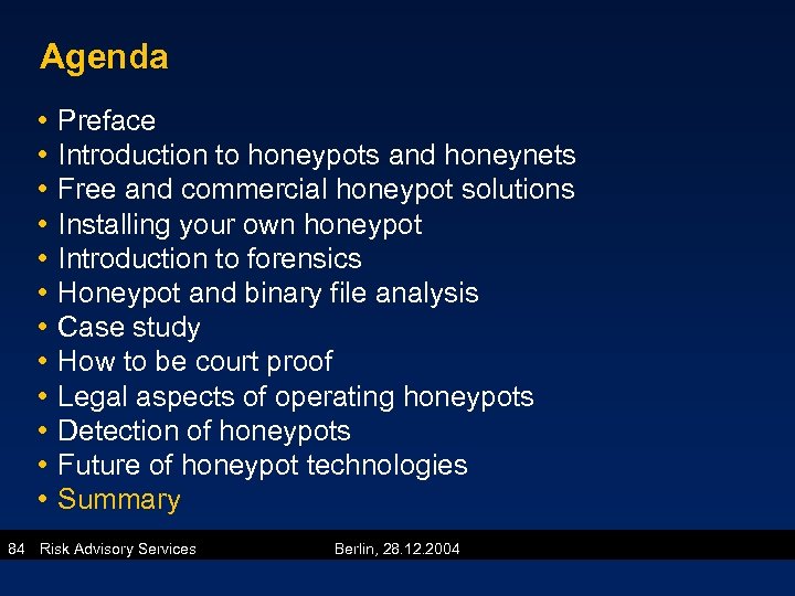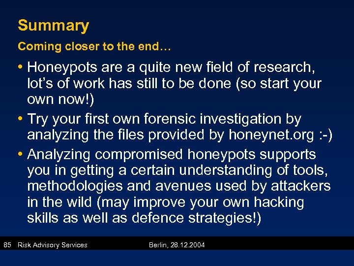 Agenda • • • Preface Introduction to honeypots and honeynets Free and commercial honeypot solutions Installing your own honeypot Introduction to forensics Honeypot and binary file analysis Case study How to be court proof Legal aspects of operating honeypots Detection of honeypots Future of honeypot technologies Summary 84 Risk Advisory Services Berlin, 28. 12. 2004