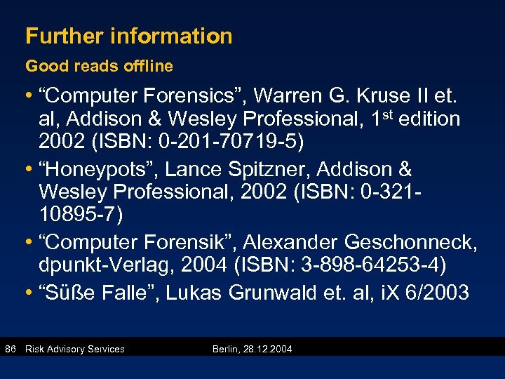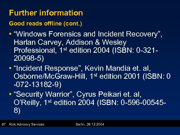 Further information Good reads offline • “Computer Forensics”, Warren G. Kruse II et. al, Addison & Wesley Professional, 1 st edition 2002 (ISBN: 0 -201 -70719 -5) • “Honeypots”, Lance Spitzner, Addison & Wesley Professional, 2002 (ISBN: 0 -32110895 -7) • “Computer Forensik”, Alexander Geschonneck, dpunkt-Verlag, 2004 (ISBN: 3 -898 -64253 -4) • “Süße Falle”, Lukas Grunwald et. al, i. X 6/2003 86 Risk Advisory Services Berlin, 28. 12. 2004