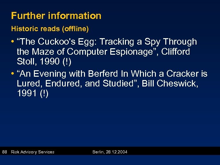 Further information Historic reads (offline) • “The Cuckoo's Egg: Tracking a Spy Through the Maze of Computer Espionage”, Clifford Stoll, 1990 (!) • “An Evening with Berferd In Which a Cracker is Lured, Endured, and Studied”, Bill Cheswick, 1991 (!) 88 Risk Advisory Services Berlin, 28. 12. 2004