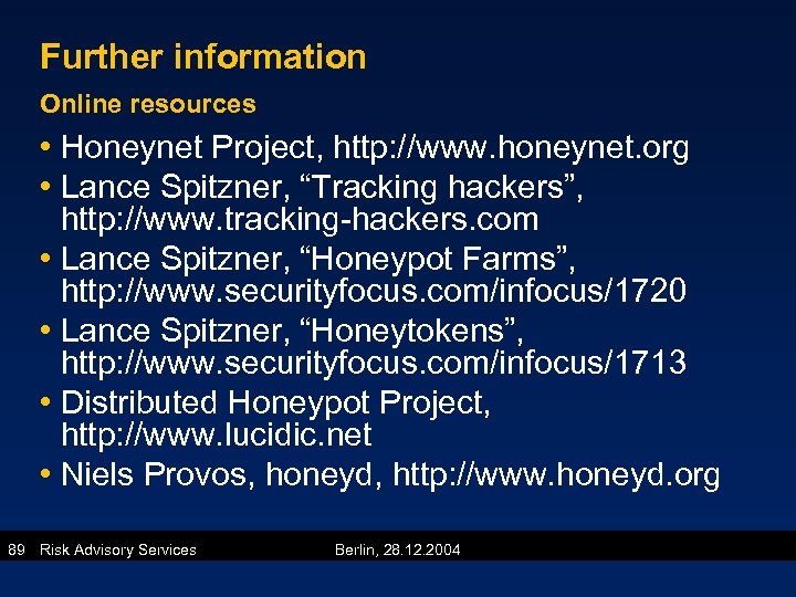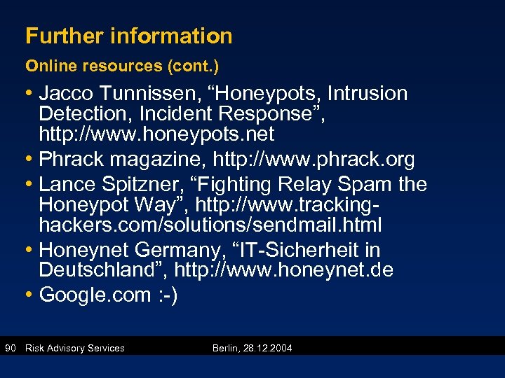 Further information Online resources • Honeynet Project, http: //www. honeynet. org • Lance Spitzner, “Tracking hackers”, http: //www. tracking-hackers. com • Lance Spitzner, “Honeypot Farms”, http: //www. securityfocus. com/infocus/1720 • Lance Spitzner, “Honeytokens”, http: //www. securityfocus. com/infocus/1713 • Distributed Honeypot Project, http: //www. lucidic. net • Niels Provos, honeyd, http: //www. honeyd. org 89 Risk Advisory Services Berlin, 28. 12. 2004