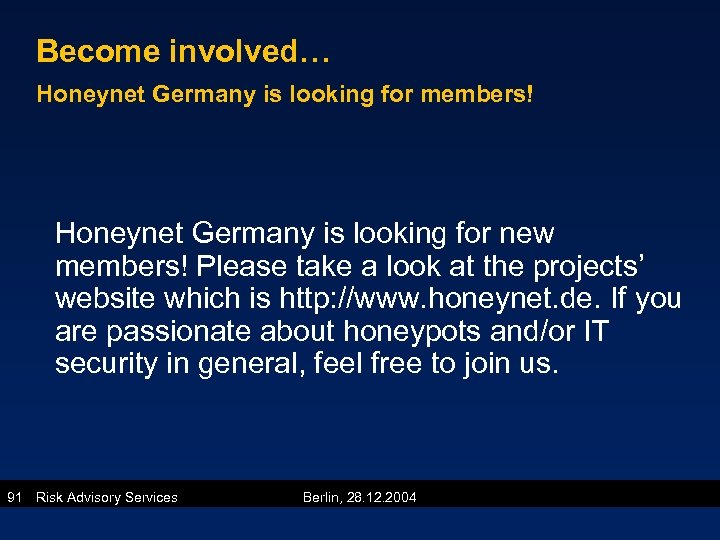 Become involved… Honeynet Germany is looking for members! Honeynet Germany is looking for new members! Please take a look at the projects’ website which is http: //www. honeynet. de. If you are passionate about honeypots and/or IT security in general, feel free to join us. 91 Risk Advisory Services Berlin, 28. 12. 2004