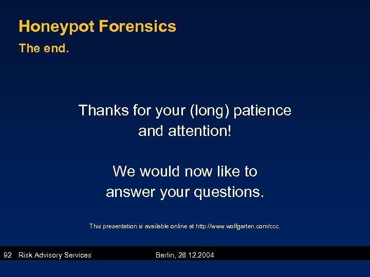 Honeypot Forensics The end. Thanks for your (long) patience and attention! We would now like to answer your questions. This presentation is available online at http: //www. wolfgarten. com/ccc. 92 Risk Advisory Services Berlin, 28. 12. 2004