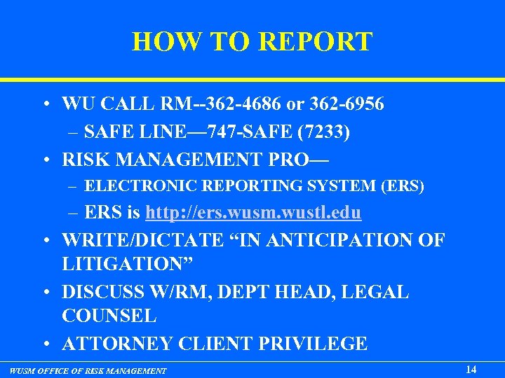 HOW TO REPORT • WU CALL RM--362 -4686 or 362 -6956 – SAFE LINE— 747 -SAFE (7233) • RISK MANAGEMENT PRO— – ELECTRONIC REPORTING SYSTEM (ERS) – ERS is http: //ers. wusm. wustl. edu • WRITE/DICTATE “IN ANTICIPATION OF LITIGATION” • DISCUSS W/RM, DEPT HEAD, LEGAL COUNSEL • ATTORNEY CLIENT PRIVILEGE WUSM OFFICE OF RISK MANAGEMENT 14
