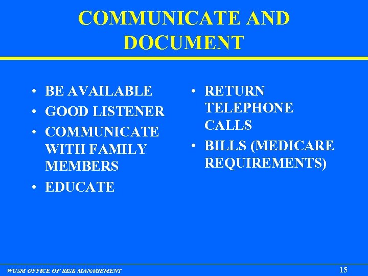 COMMUNICATE AND DOCUMENT • BE AVAILABLE • GOOD LISTENER • COMMUNICATE WITH FAMILY MEMBERS • EDUCATE WUSM OFFICE OF RISK MANAGEMENT • RETURN TELEPHONE CALLS • BILLS (MEDICARE REQUIREMENTS) 15