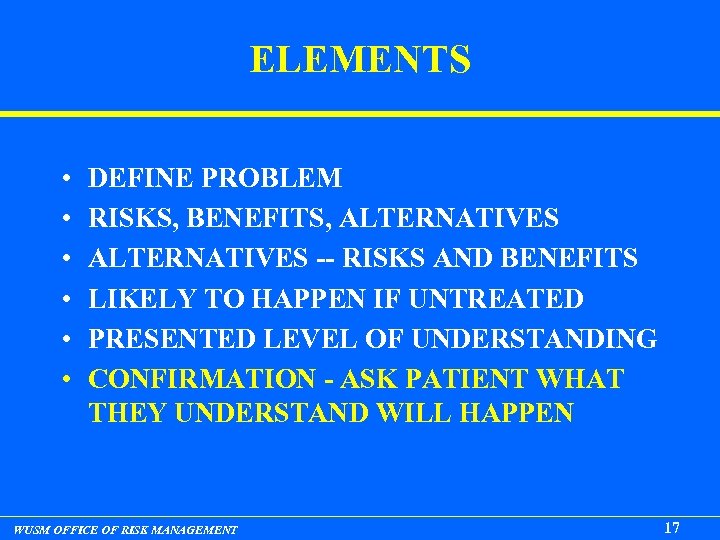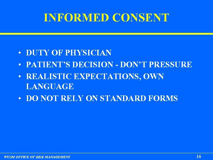 INFORMED CONSENT • DUTY OF PHYSICIAN • PATIENT’S DECISION - DON’T PRESSURE • REALISTIC EXPECTATIONS, OWN LANGUAGE • DO NOT RELY ON STANDARD FORMS WUSM OFFICE OF RISK MANAGEMENT 16