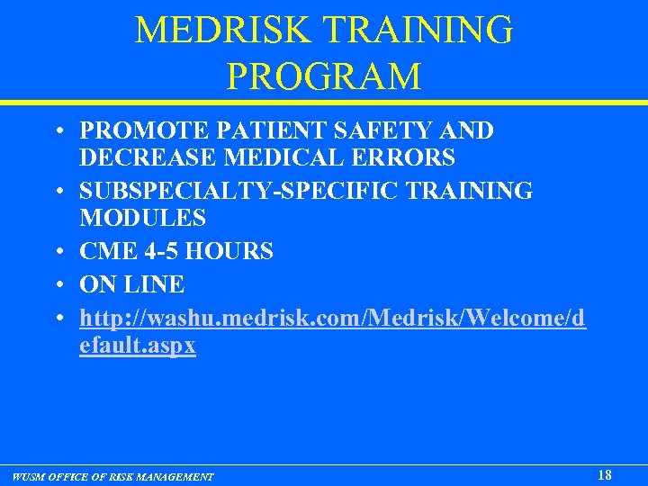 MEDRISK TRAINING PROGRAM • PROMOTE PATIENT SAFETY AND DECREASE MEDICAL ERRORS • SUBSPECIALTY-SPECIFIC TRAINING MODULES • CME 4 -5 HOURS • ON LINE • http: //washu. medrisk. com/Medrisk/Welcome/d efault. aspx WUSM OFFICE OF RISK MANAGEMENT 18