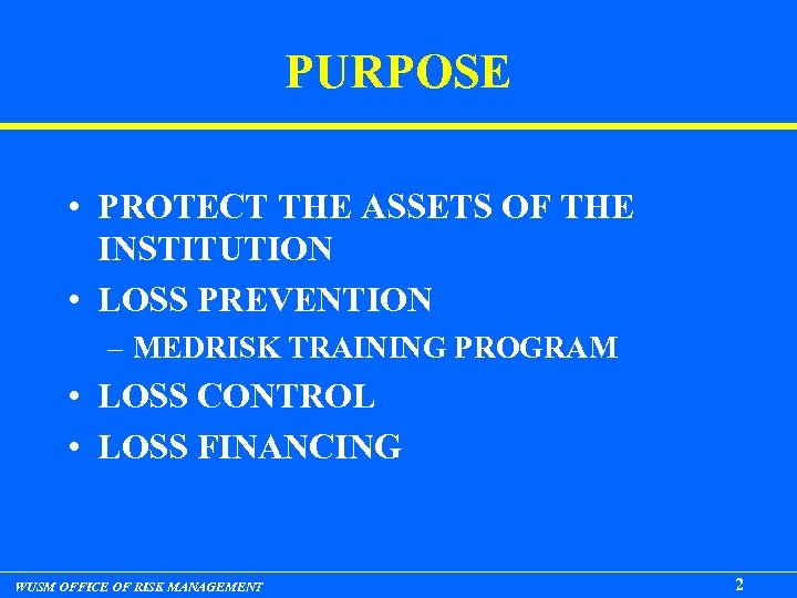 PURPOSE • PROTECT THE ASSETS OF THE INSTITUTION • LOSS PREVENTION – MEDRISK TRAINING PROGRAM • LOSS CONTROL • LOSS FINANCING WUSM OFFICE OF RISK MANAGEMENT 2