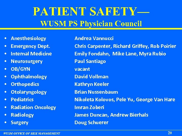 RISK MANAGEMENT WEB SITE http: //medicine. wustl. edu/risk • GENERAL INFORMATION • RISK MONITOR PRO – EVENT REPORTING SYSTEM (ERS) • PROFESSIONAL LIABILITY INSURANCE • EDUCATION SECTION WUSM OFFICE OF RISK MANAGEMENT 19